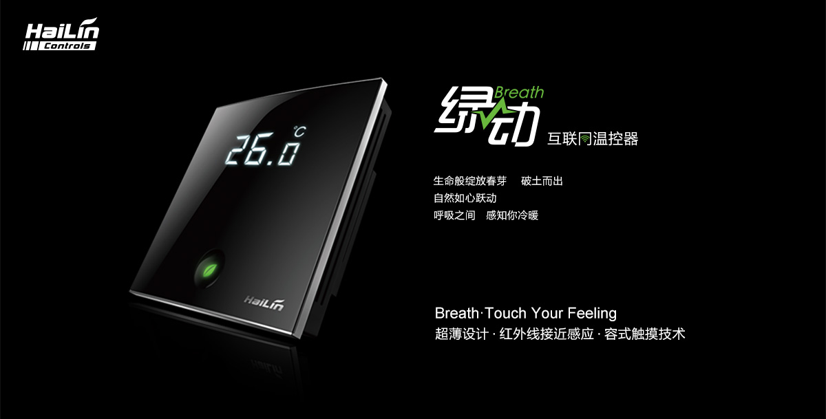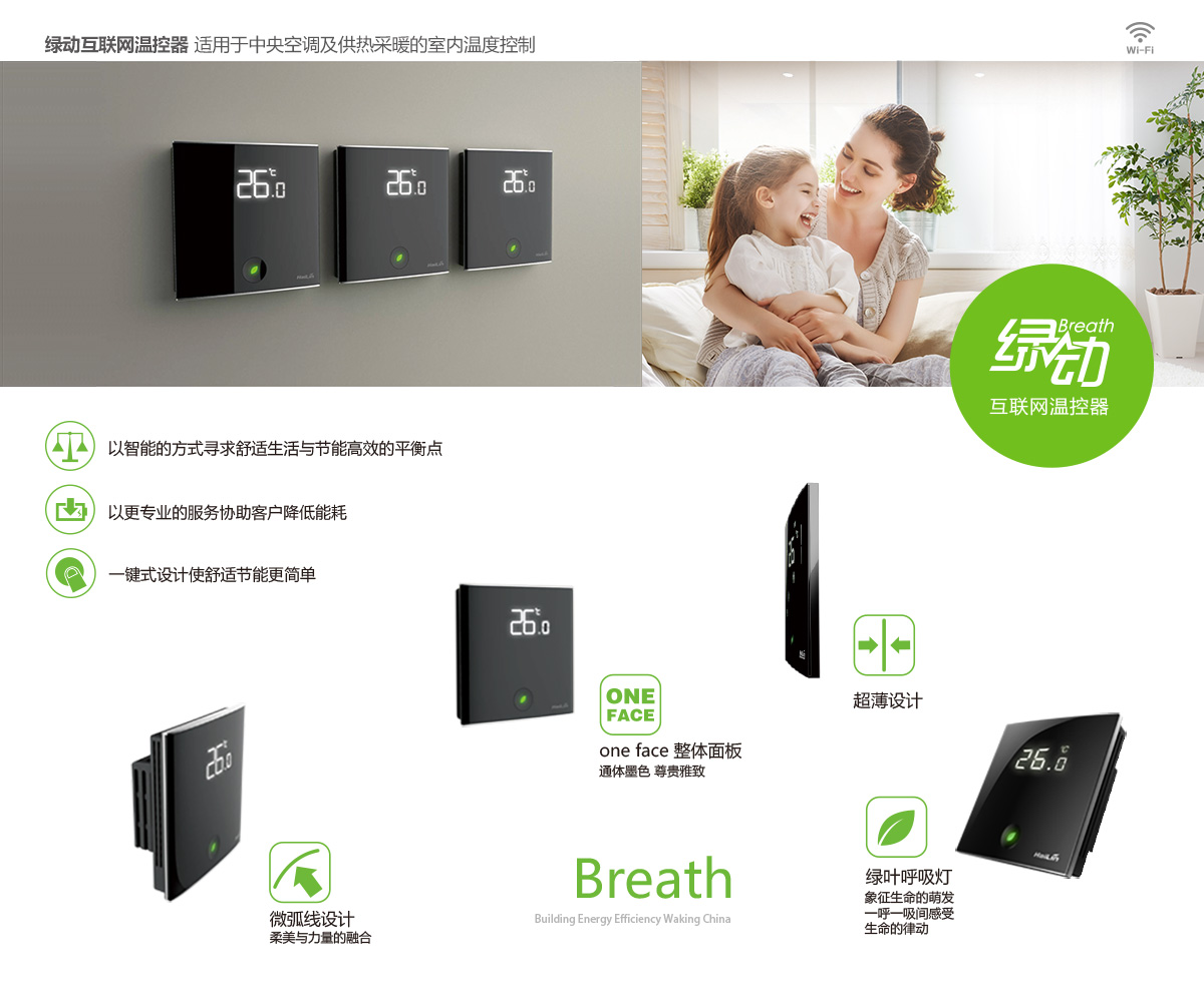 綠動溫控器適用于中央空調風機盤管系統或風管道系統,自動調節室內溫度。微弧線曲面設計彰顯柔美與力量融合,面板整體睿墨含蓄,尊貴雅致,綠葉呼吸燈時尚點綴,如呼吸間感受生命律動,象征生命萌發。
