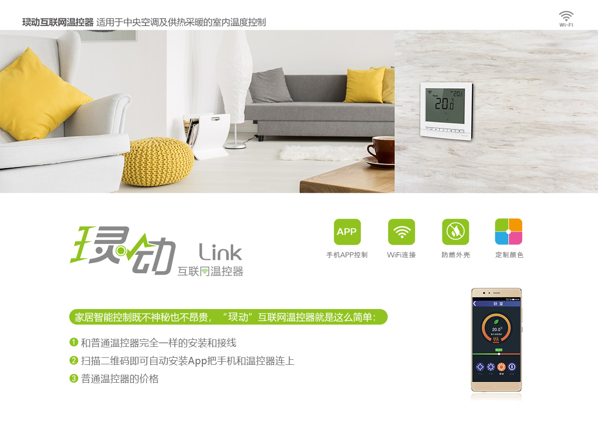 ?動溫控器適用于家庭地板采暖系統(tǒng)或散熱器采暖系統(tǒng)的室內(nèi)溫度控制。一體化弧形表面設(shè)計簡潔流暢,多彩定制搭配滿足家居裝飾選擇需求,進(jìn)口材質(zhì)、安全耐候性強(qiáng),網(wǎng)絡(luò)連接安裝簡單、操作便捷,感知靈敏、控制精準(zhǔn)。