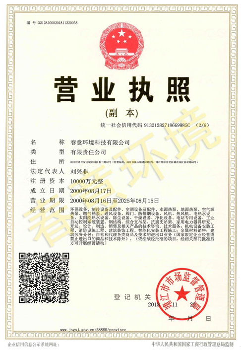 春意環境科技有限公司 地址:江蘇省靖江市經濟開發區城北園區富前路68號(總部);江蘇省靖江市經濟開發區城北園區新三路62號(南廠區); 江蘇省靖江市孤山鎮清河路2號(北廠區)